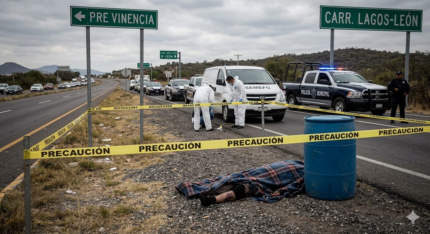 LAGOS DE MORENO, JAL. – La tarde de este viernes 24 de abril, el cuerpo de una persona sin vida fue localizado a un costado de la carretera federal Lagos de Moreno-León, en el tramo conocido como «La Curva del Pato».