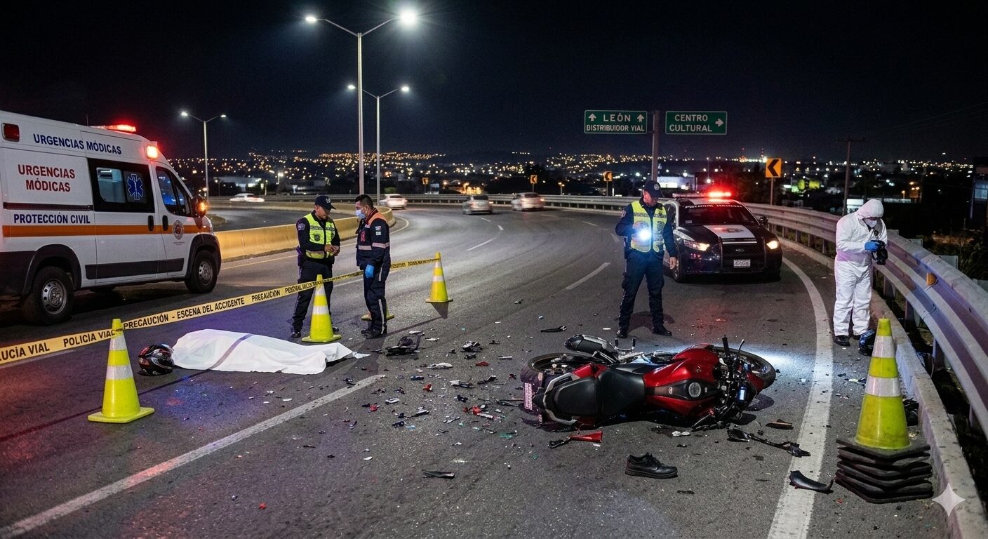 LEÓN, GTO. – La madrugada de este lunes 27 de abril, el Distribuidor Vial que conecta San Francisco del Rincón con León fue escenario de un fatal accidente donde un motociclista de aproximadamente 25 años perdió la vida tras perder el control de su unidad.